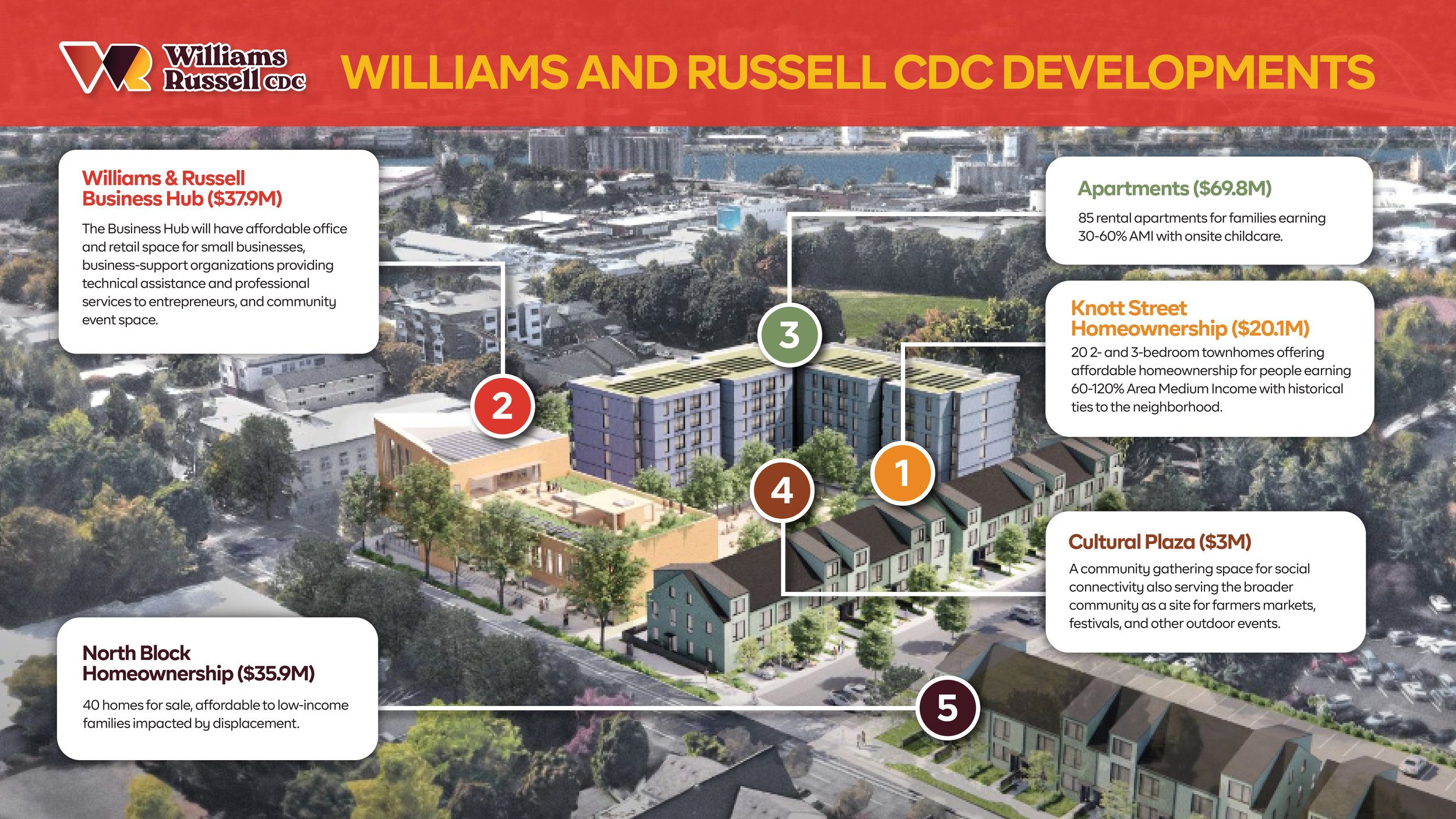 20 high-quality townhomes (2BR & 3BR), with four featuring accessible ground-floor units. Aimed at 60–120% AMI families building generational wealth where they belong.